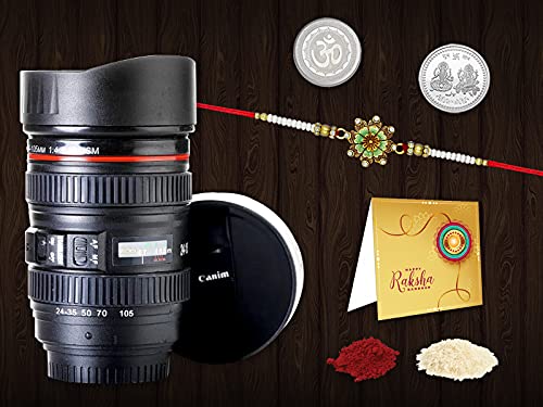 Buy Designer Rakhi Combo | Rakhi for Men with Roli Chawal Tilak, Camera Lens Coffee Mug and Greeting Card, Laxmi Ganesh Silver Coin | Festival of Raksabandhan | K1_1052_M720