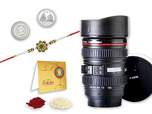 Buy Designer Rakhi Combo | Rakhi for Men with Roli Chawal Tilak, Camera Lens Coffee Mug and Greeting Card, Laxmi Ganesh Silver Coin | Festival of Raksabandhan | K1_1052_M720