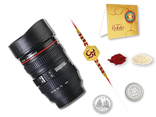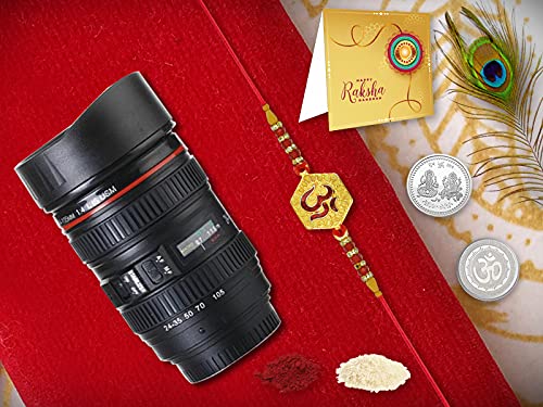 Buy Designer Rakhi Combo | Rakhi for Men with Roli Chawal Tilak, Camera Lens Coffee Mug and Greeting Card, Laxmi Ganesh Silver Coin | Festival of Raksabandhan | K1_14_M720